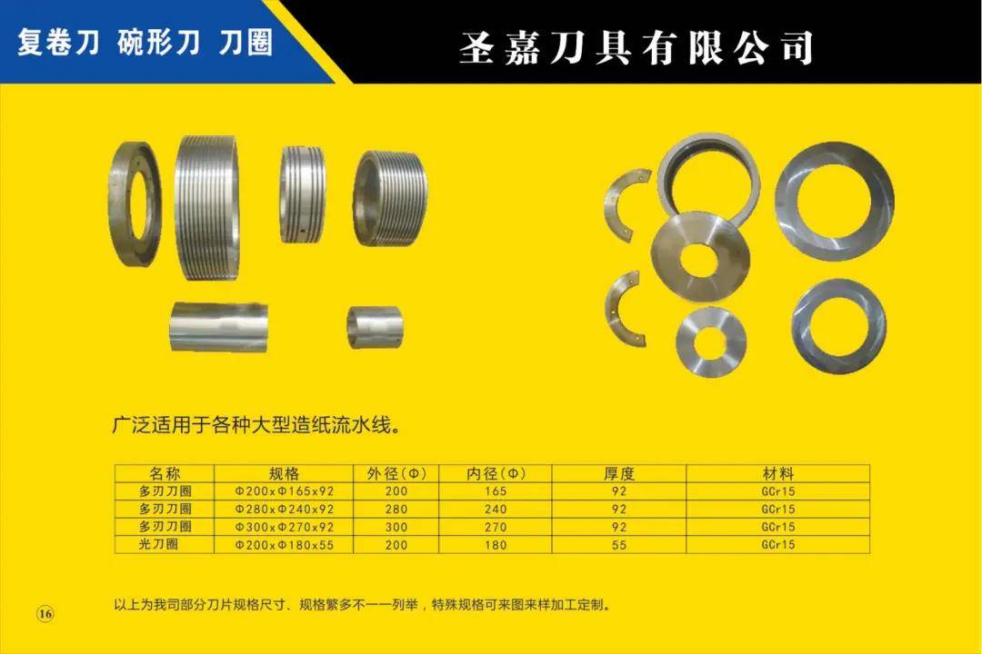 本公司所生產(chǎn)的各種型號規(guī)格分切、分條、分紙、復(fù)卷機(jī)圓刀片(蝶形上刀片、上刀架、下刀片、隔片、隔套、底棍、復(fù)卷刀、碗形刀、刀圈、大回旋圓切刀、砂輪、壓花輪、折疊刀、齒刀、異形刀)橫切刀、裁切刀、熱切刀、粉碎刀、切粒刀、撕碎刀、折頁刀、開槽刀、油墨刮刀、切臺圓刀、三孔刀、切管刀、氣壓刀組、剪切刀組、熱切刀組廣泛適用于造紙、紙制品加工、膠粘帶制品、薄膜、電線電纜、橡膠、輪胎、鋁箔、化纖、非織造布、復(fù)合包裝、卷煙、皮革、印刷、服飾輔料等行業(yè)。